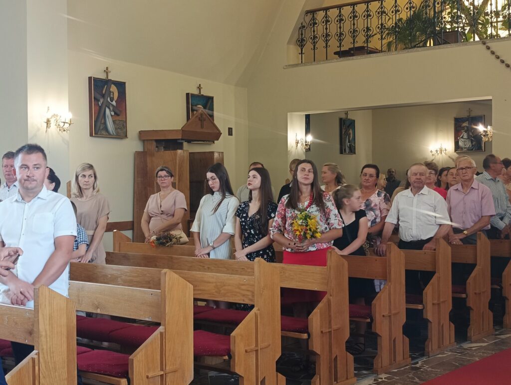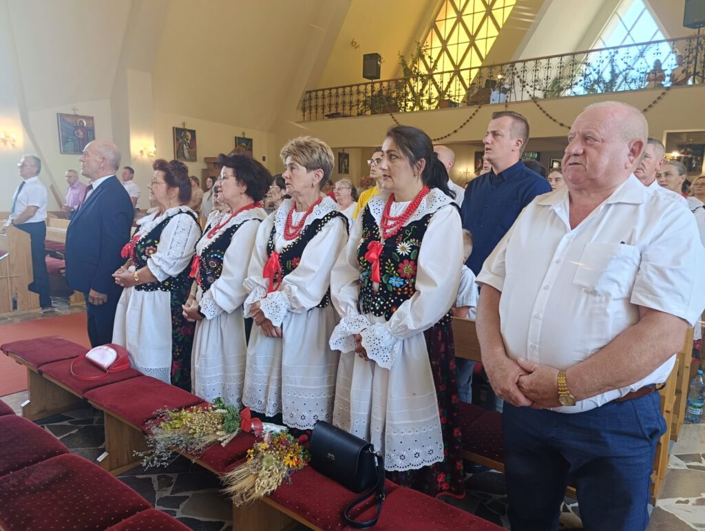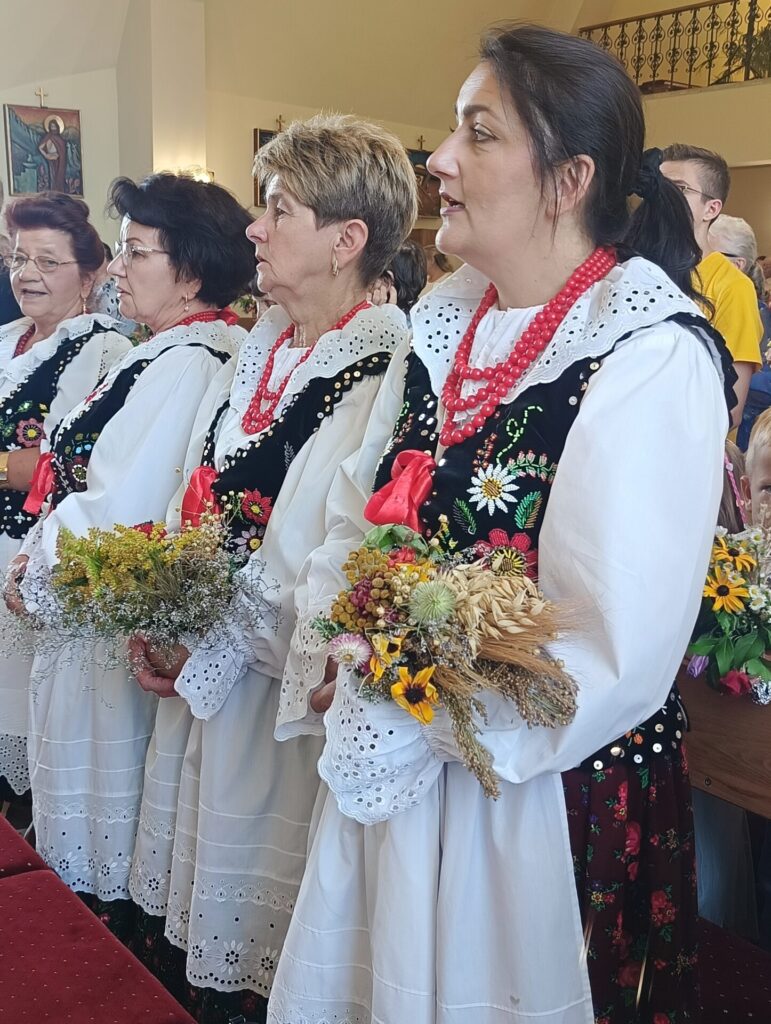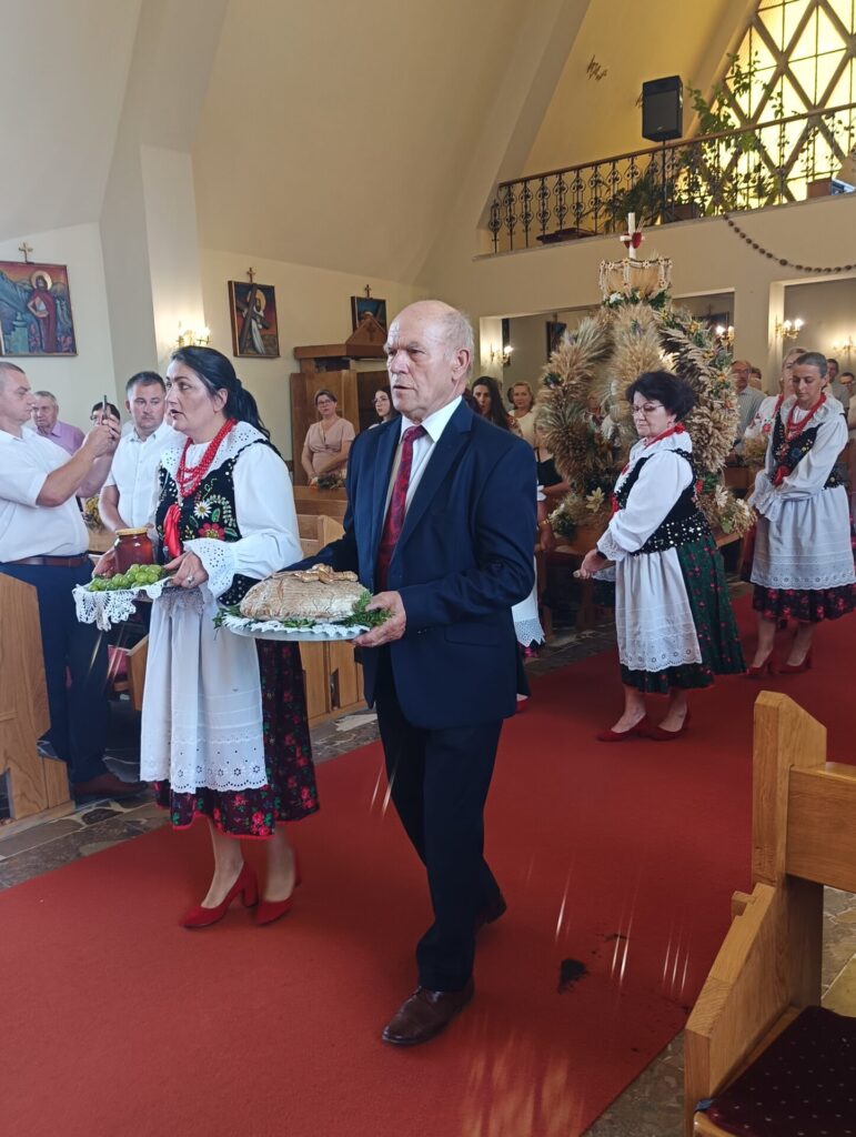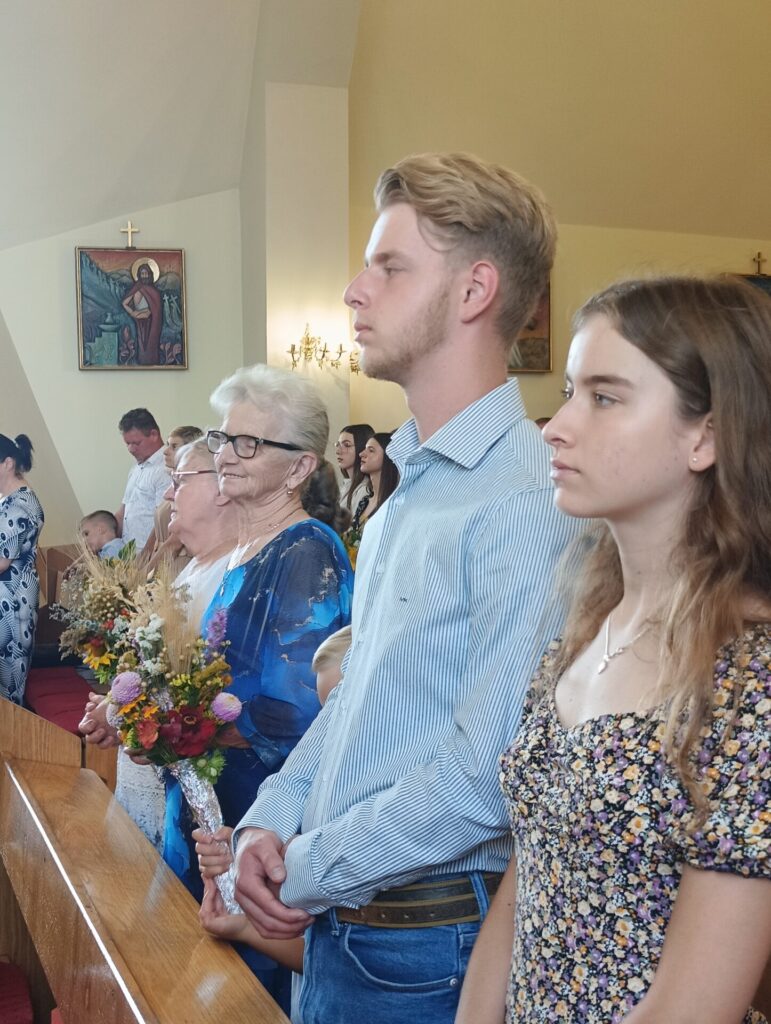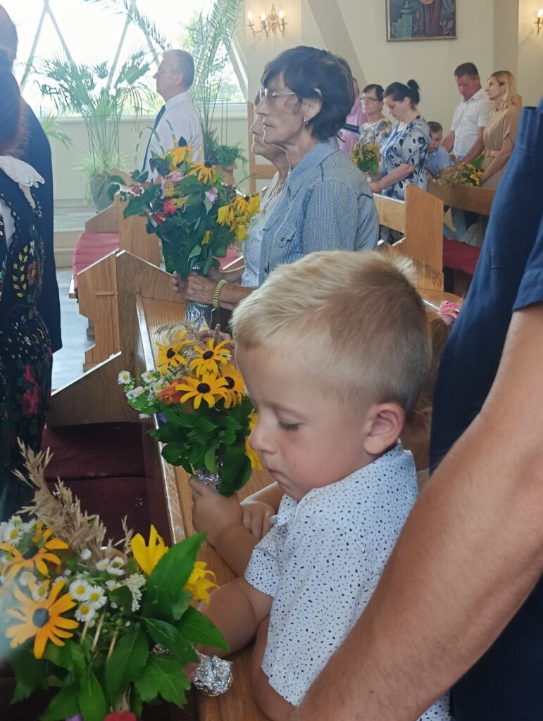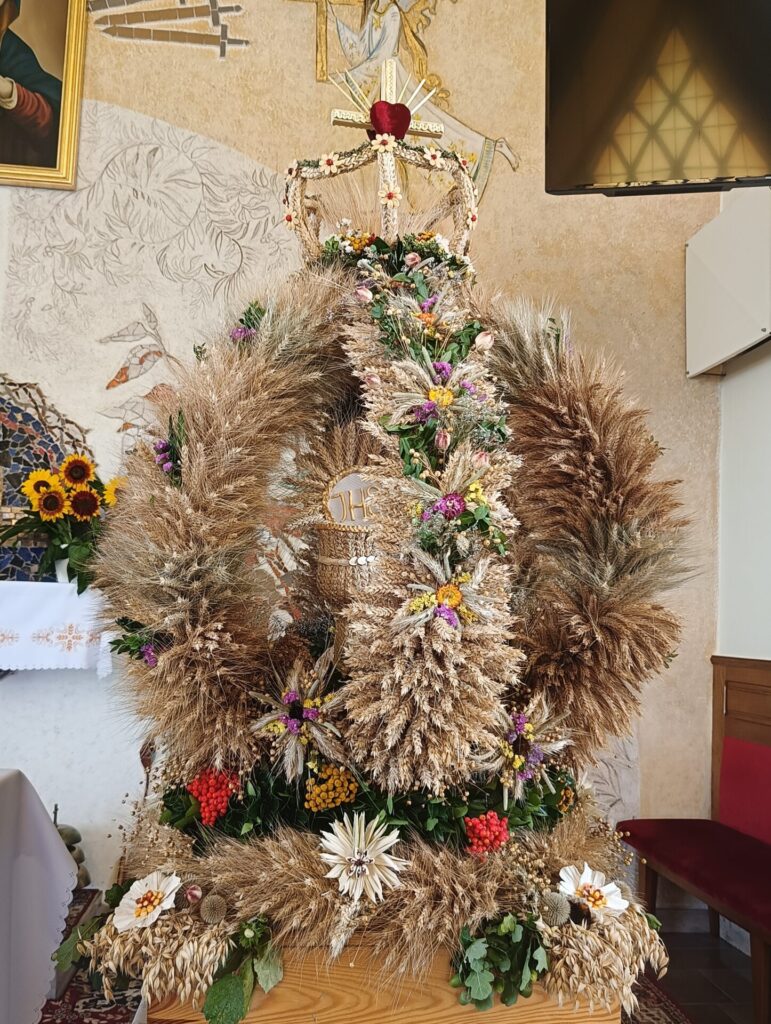 W piątkową uroczystość na każdej Mszy św. odbyło się poświęcenie ziół przyniesionych przez wiernych do kościoła jako wyraz wdzięczności Bogu i Matce Najświętszej za szczęśliwe żniwa. Natomiast na sumie Ks. proboszcz Stanisław Bieleń poświęcił jeszcze wieniec żniwny. Wykonało go Koło Gospodyń Wiejskich z Nieczajnej Górnej. „Gospodarze” uroczystości: Irena Łachut i sołtys Jan Bąba wraz z paniami z KGW wnieśli piękny wieniec i umieścili go w nawie głównej. Prośbę o jego poświęcenie wystosował do Ks. proboszcza Pan sołtys. Również on wraz z Ireną Łachut i Markiem Frącem włączyli się w Mszę Świętą jako obsada liturgiczna.