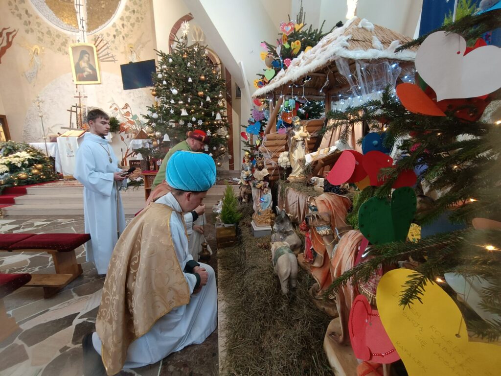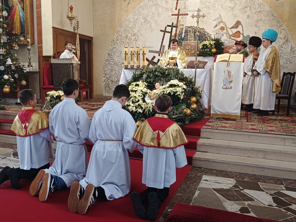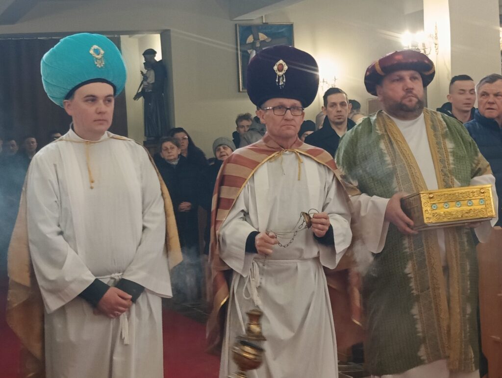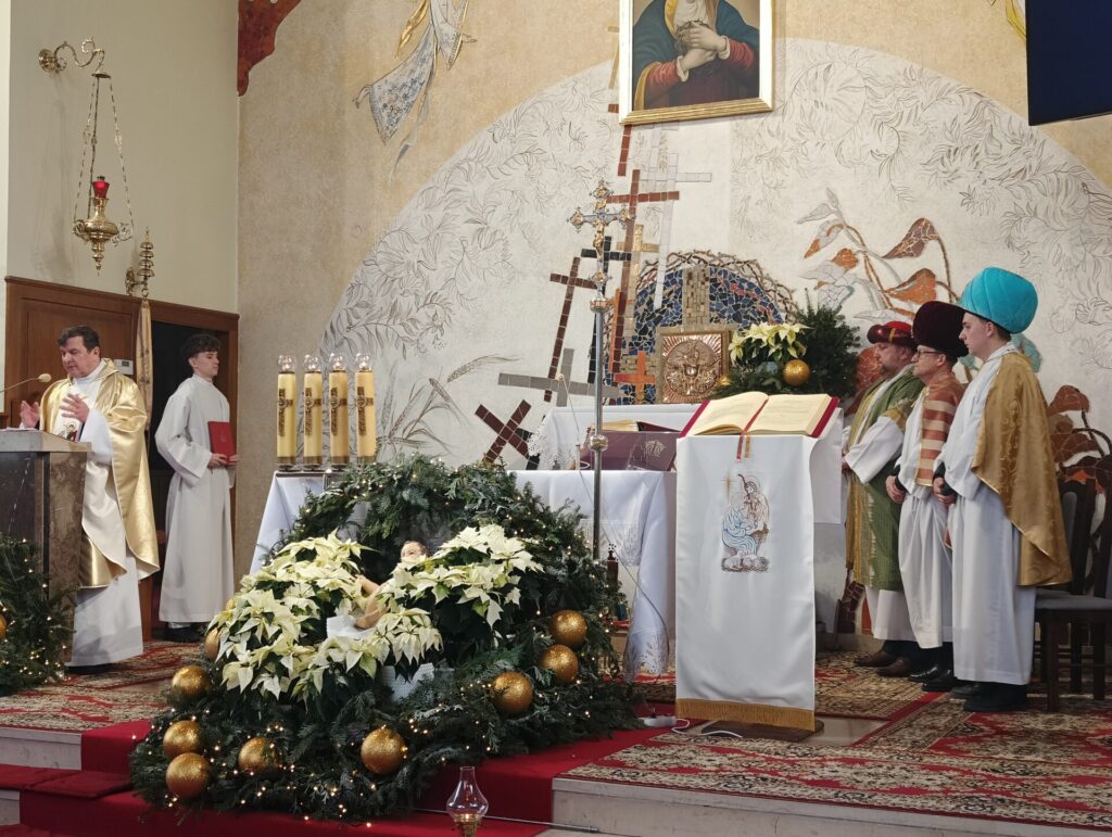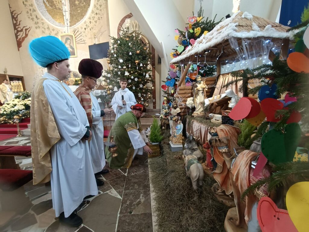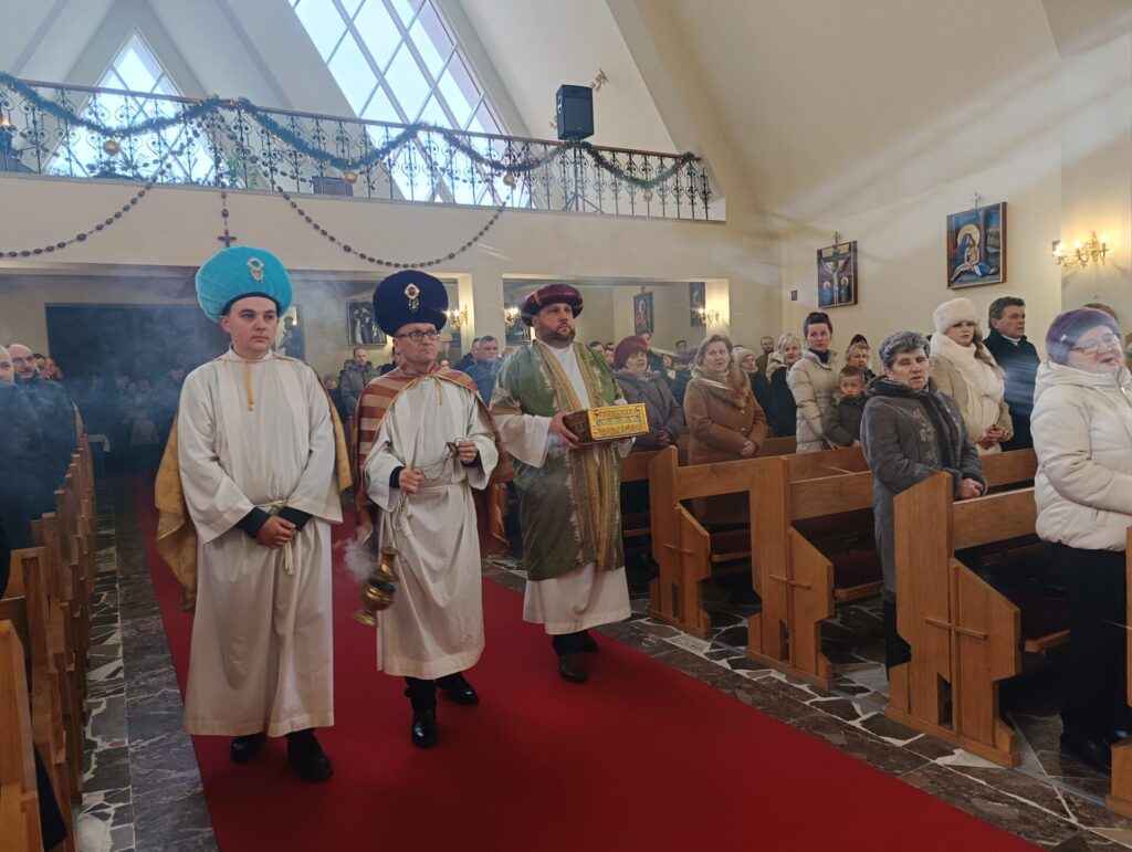 Trzej Mędrcy – Królowie zawitali dzisiaj do naszego kościoła na Mszę Świętą o godzinie 10.30. Oddali pokłon Nowonarodzonemu w szopce, składając Jezusowi dary: złoto, kadzidło i mirrę. I byli blisko ołtarza podczas sprawowania Najświętszej Ofiary. W role Kacpra, Melchiora i Baltazara wcielili się Jan Wójcik, Wojciech Wenc i p. Zbierzkowski.